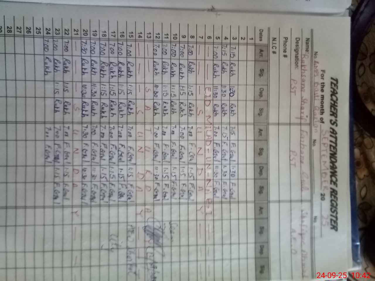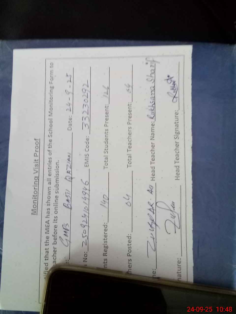 | Name: RU**** SH**** Designation: (School Headmaster's/Headmistress's) PST Phone/Cell Number: 03**** |