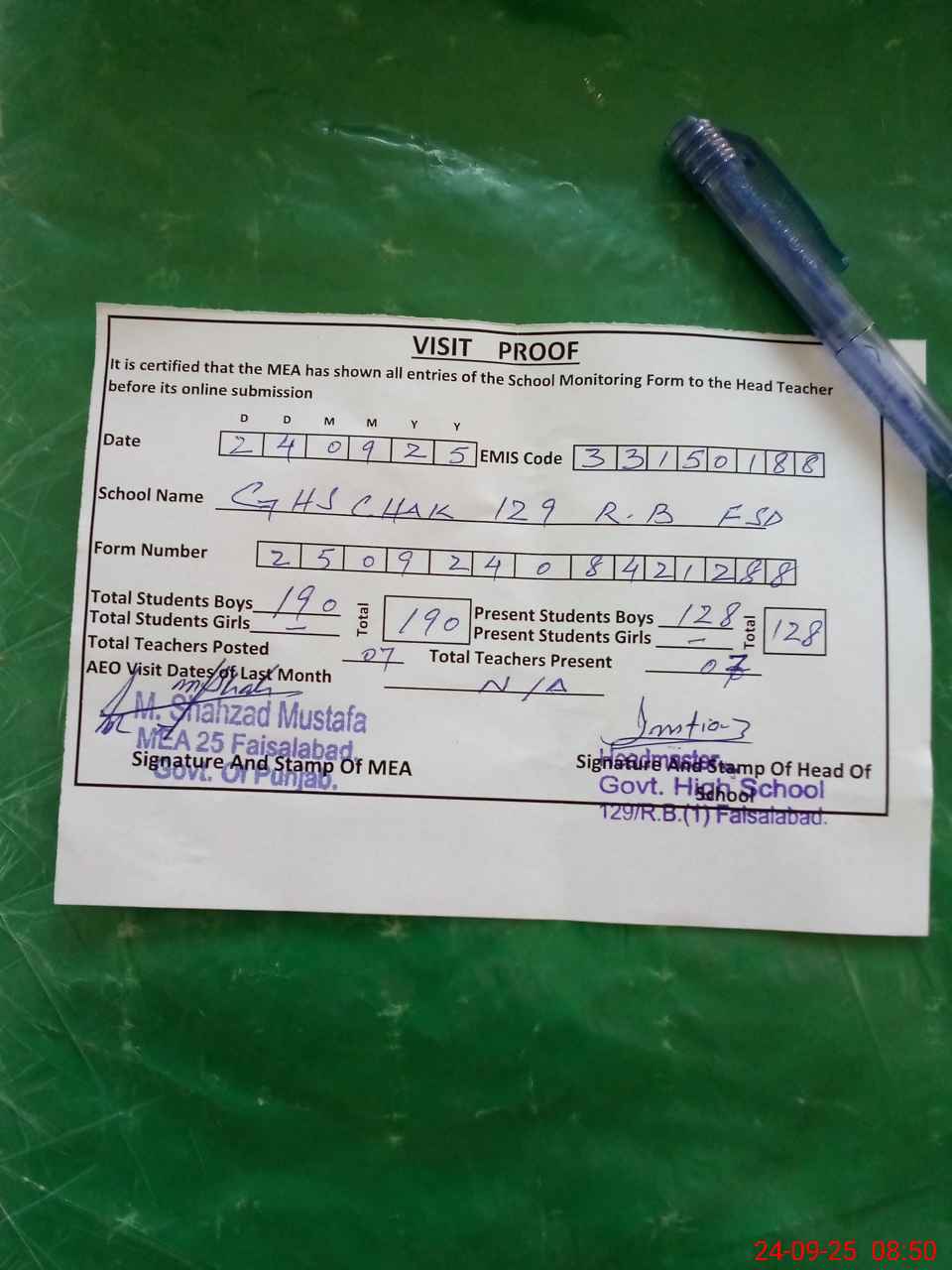 | EMIS Code: 33150188 | Name of School: GHS CHAK 129 RB | |||