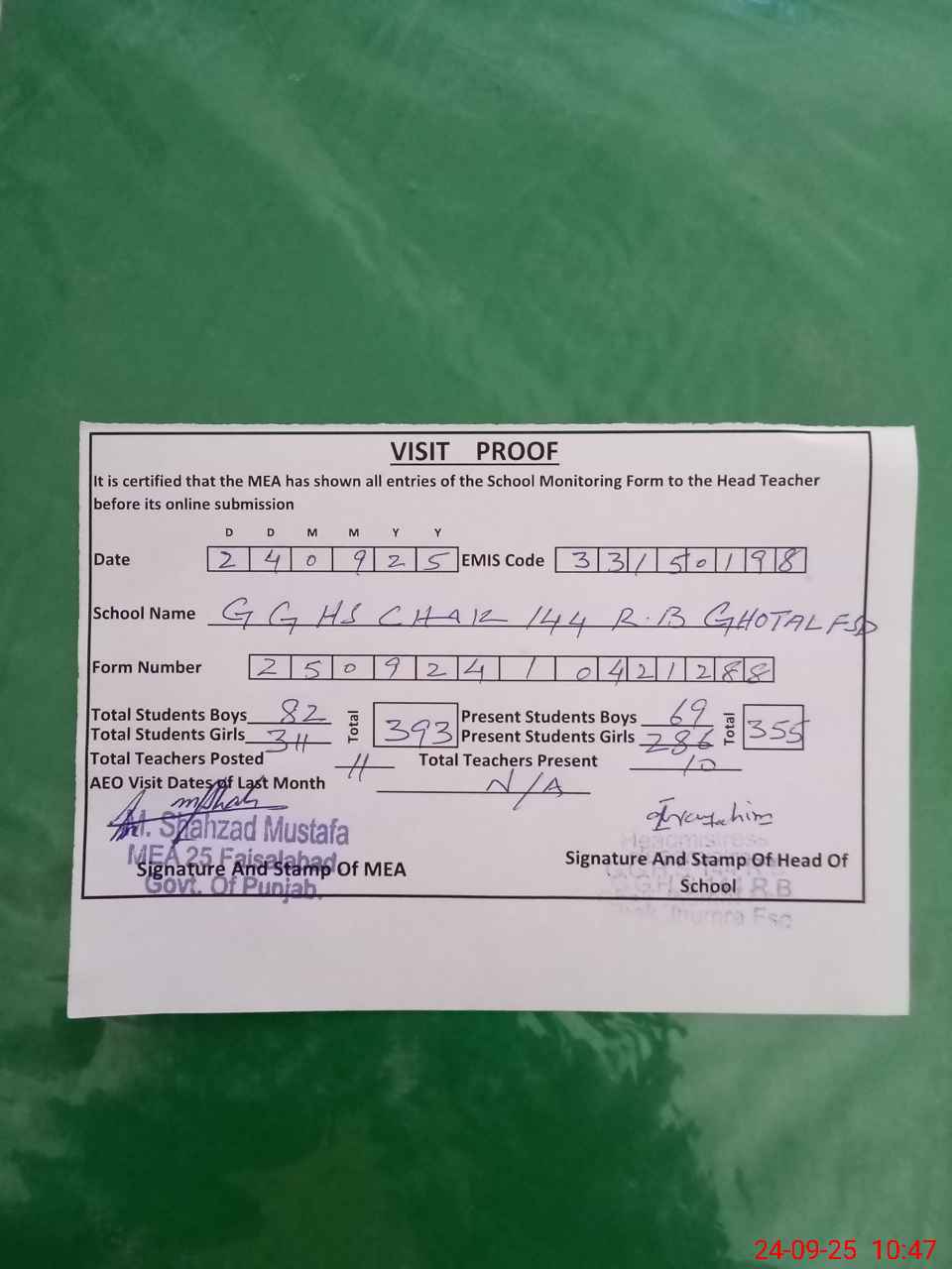 | EMIS Code: 33150198 | Name of School: GGHS CHAK NO 144 RB GHOTAL | |||