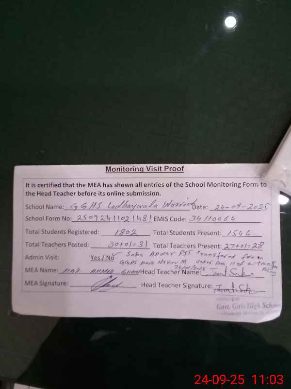 | EMIS Code: 34110064 | Name of School: GGHS LADHAY WALA WARRIACH | |||