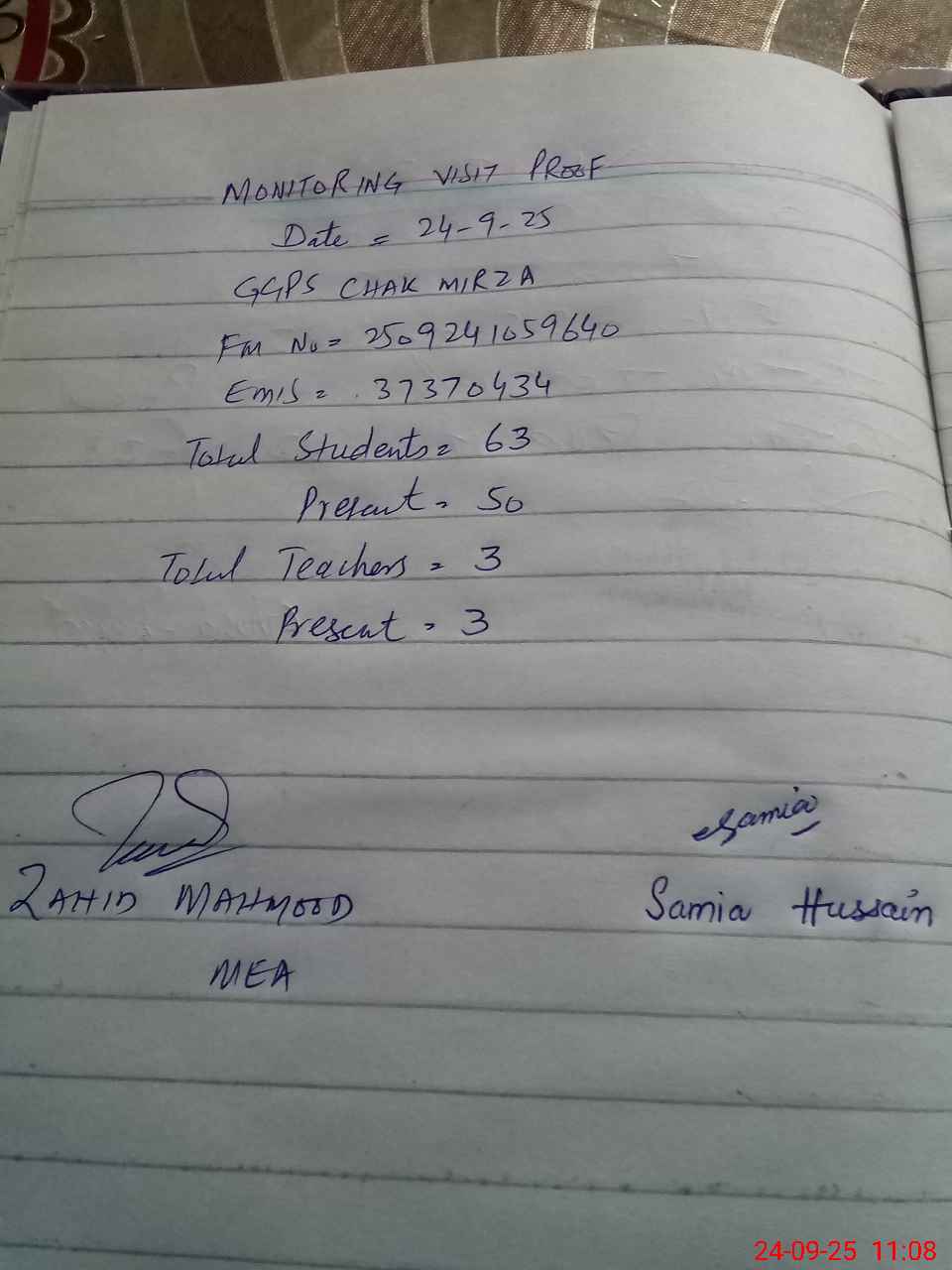 | Attendance Register | Head Teacher | MEA with School | Visit Proof |