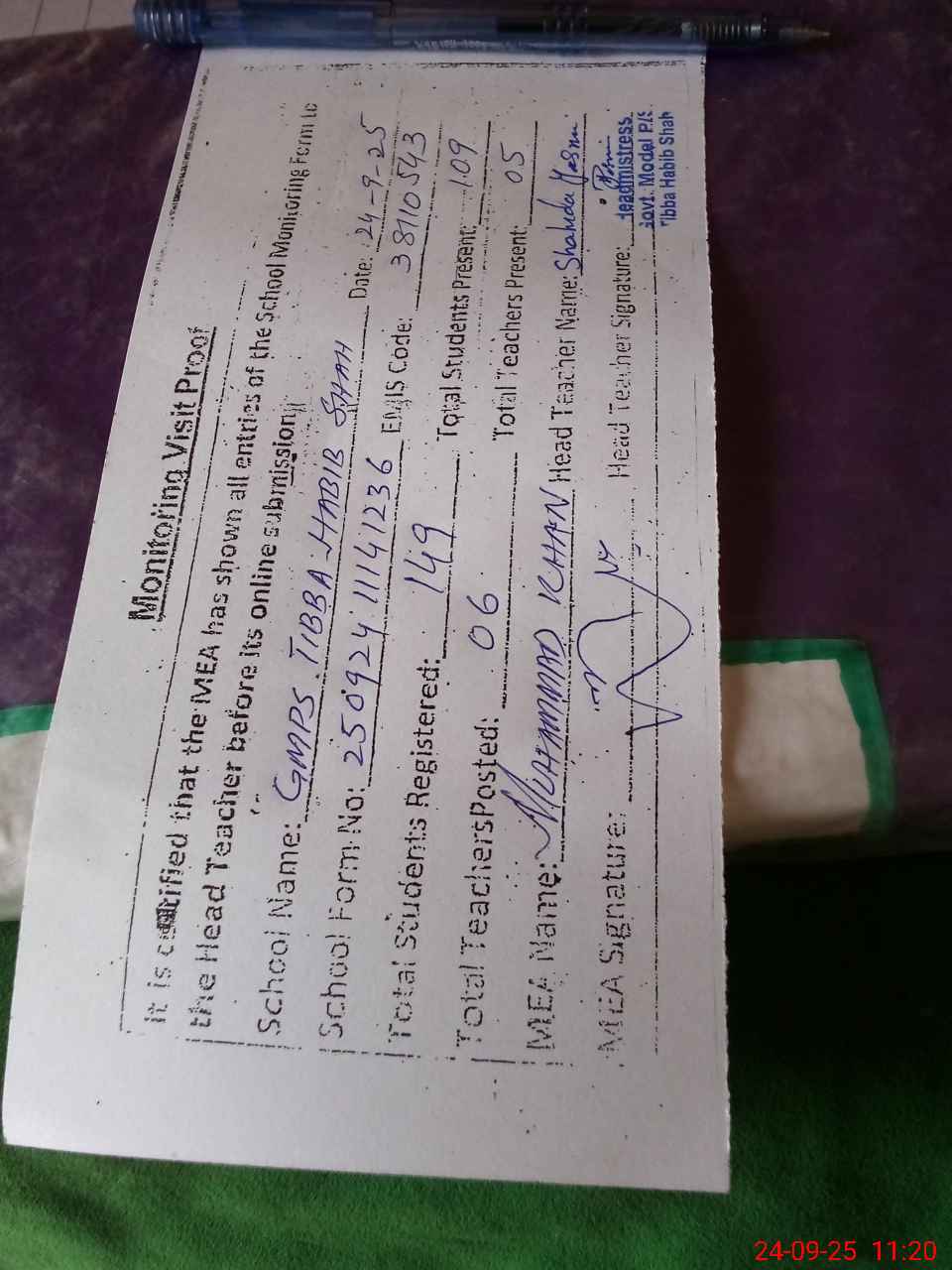 | Attendance Register | Head Teacher | MEA with School | Visit Proof |