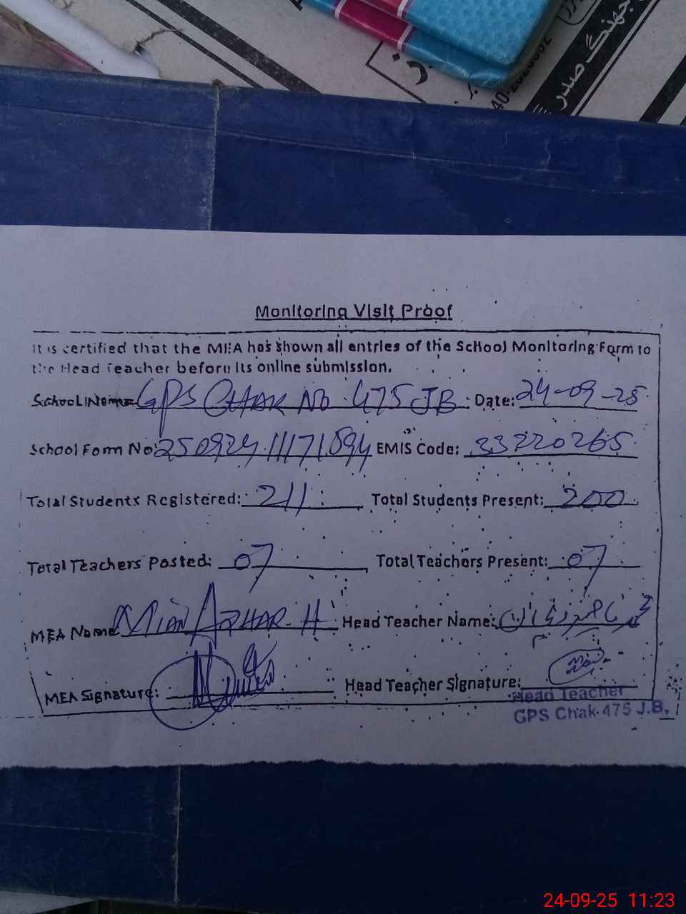 | Attendance Register | Head Teacher | MEA with School | Visit Proof |