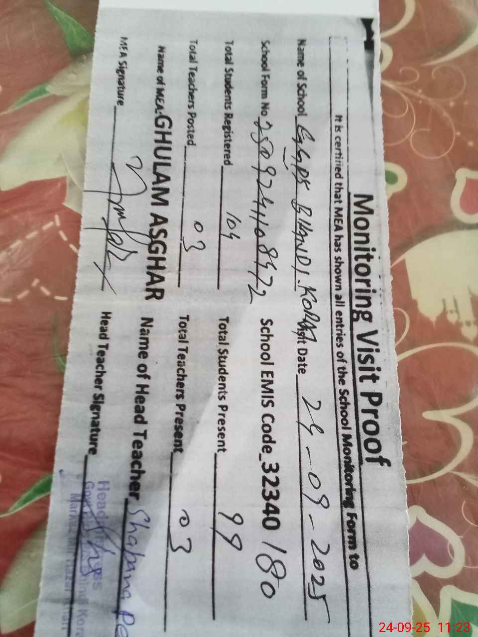 | Attendance Register | Head Teacher | MEA with School | Visit Proof |