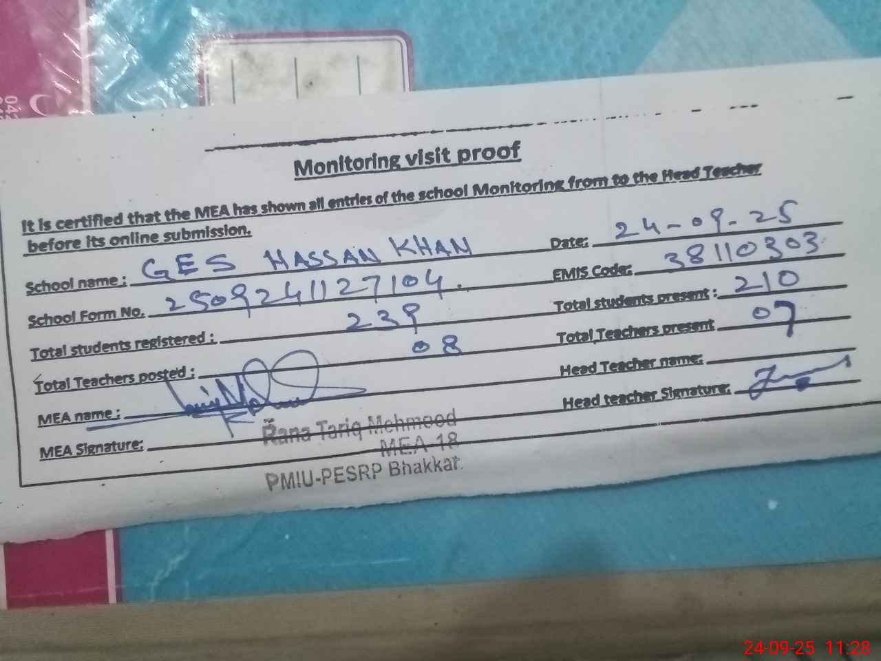 | Attendance Register | Head Teacher | MEA with School | Visit Proof |