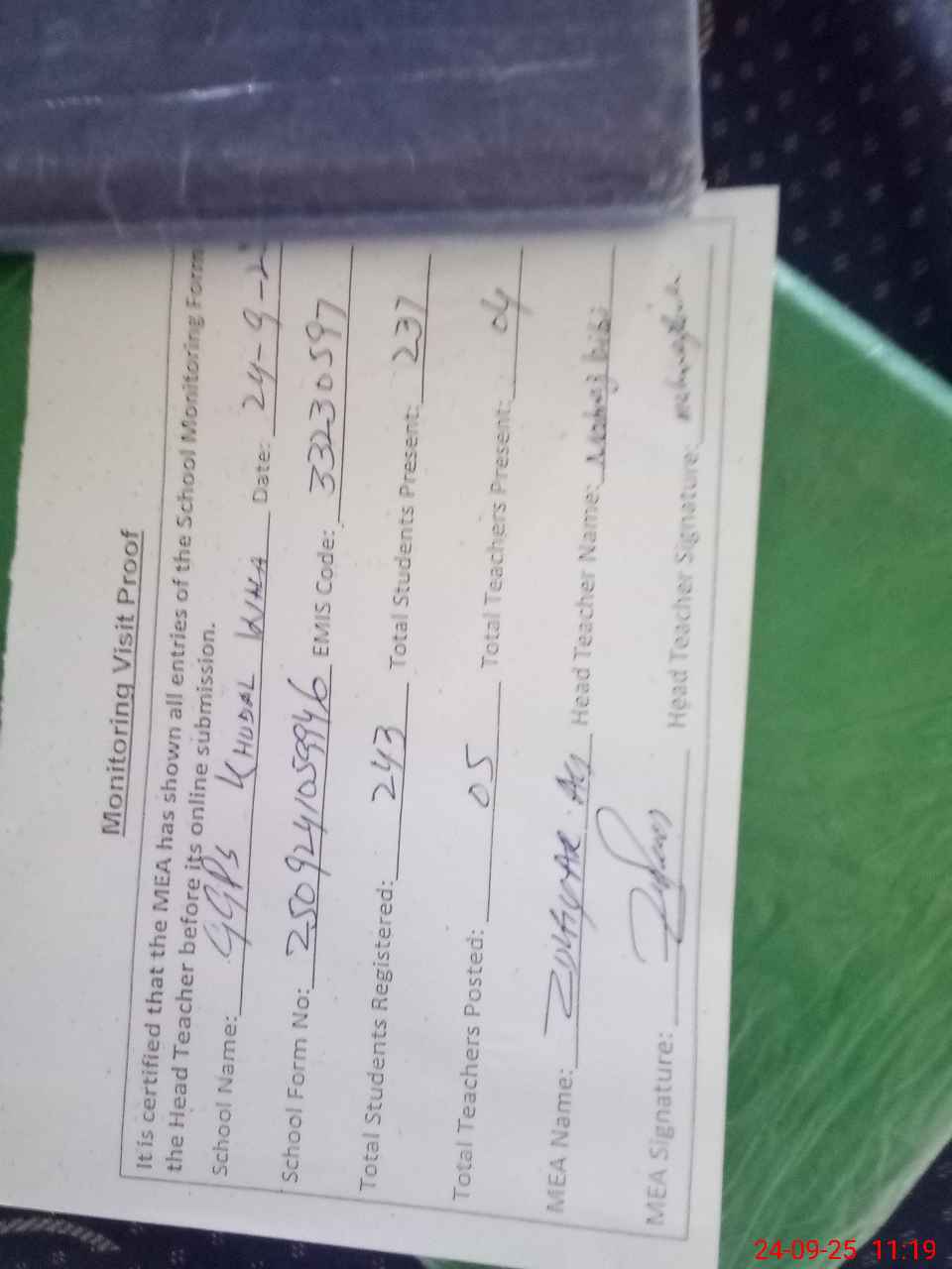 | Attendance Register | Head Teacher | MEA with School | Visit Proof |