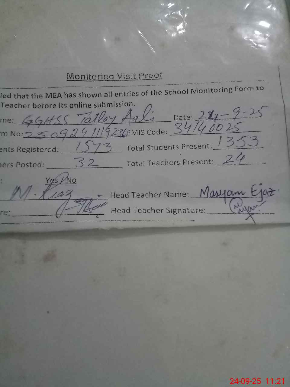| EMIS Code: 34140025 | Name of School: GGHSS TATLAY AALI | |||
