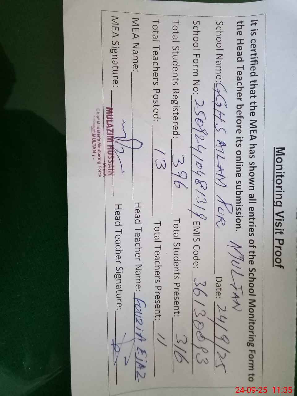 | Certified that this School was Inspected by the Undersigned MEA/DMO Today and the Information Stated Above is as Per Record. | |||||