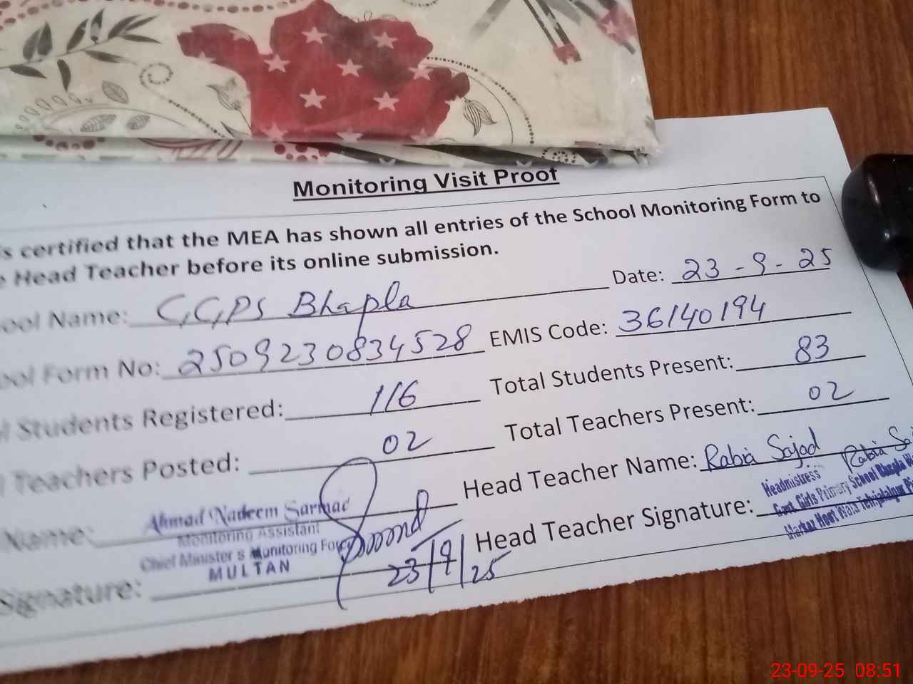 | Attendance Register | Head Teacher | MEA with School | Visit Proof |
