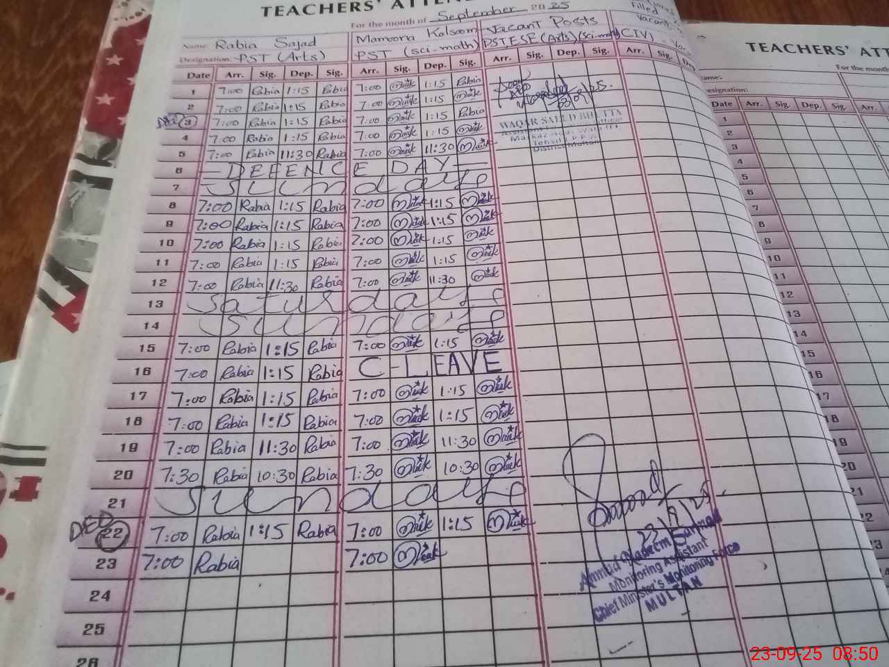 | Monitoring Date: 23-09-2025 | Start Time: 23-09-2025 08:34 AM | End Time: 23-09-2025 08:51 AM | Name of MEA: AH**** NA**** SA**** | |