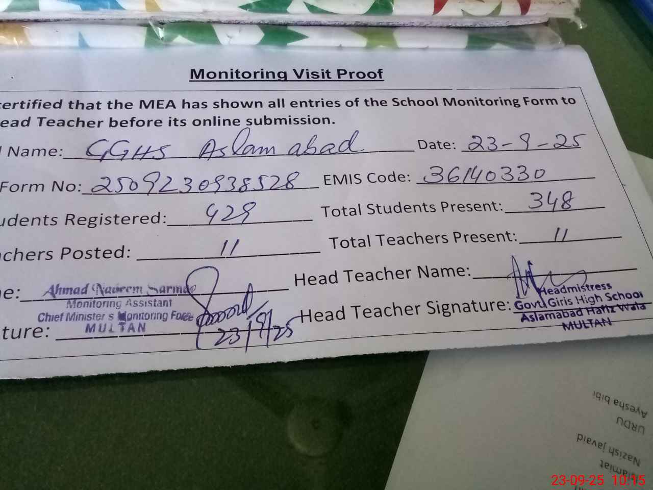 | EMIS Code: 36140330 | Name of School: GGHS ASLAM ABAD (HAFIZ WALA) | |||