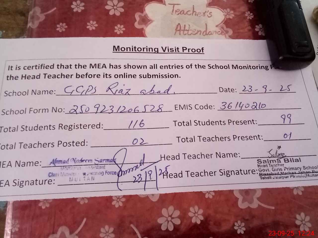| Attendance Register | Head Teacher | MEA with School | Visit Proof |