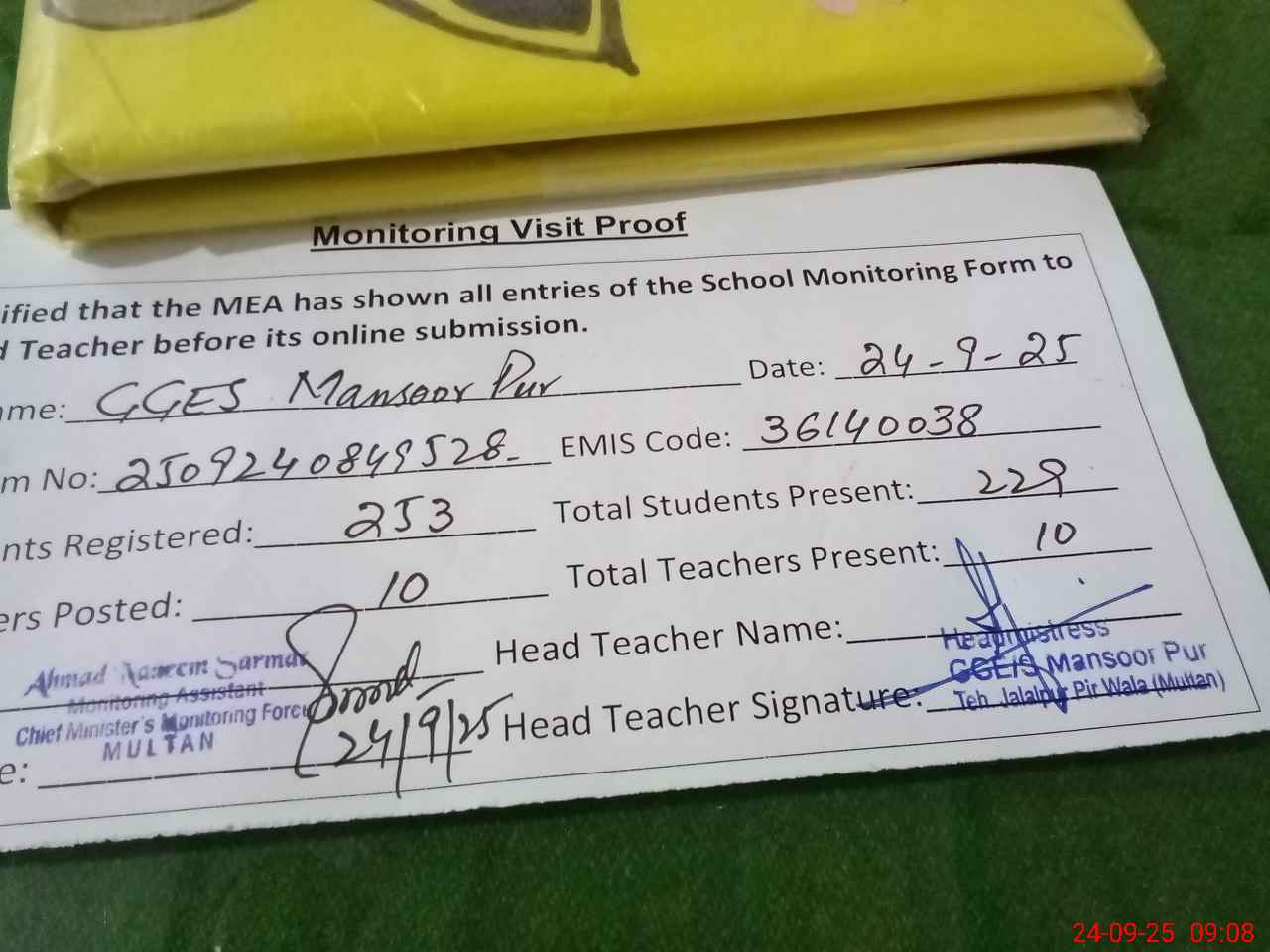 | Attendance Register | Head Teacher | MEA with School | Visit Proof |