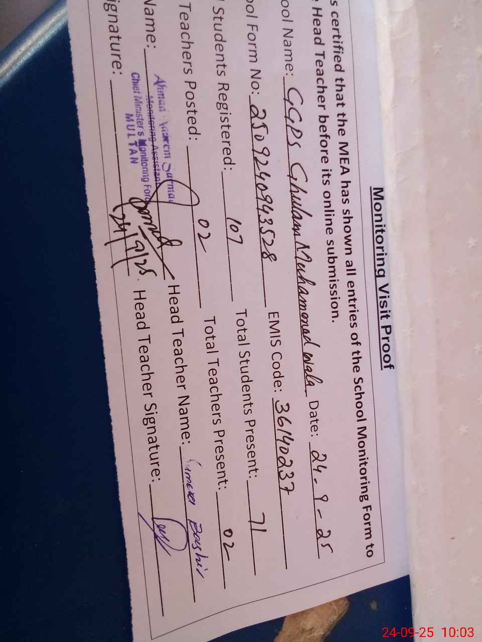 | Certified that this School was Inspected by the Undersigned MEA/DMO Today and the Information Stated Above is as Per Record. | |||||