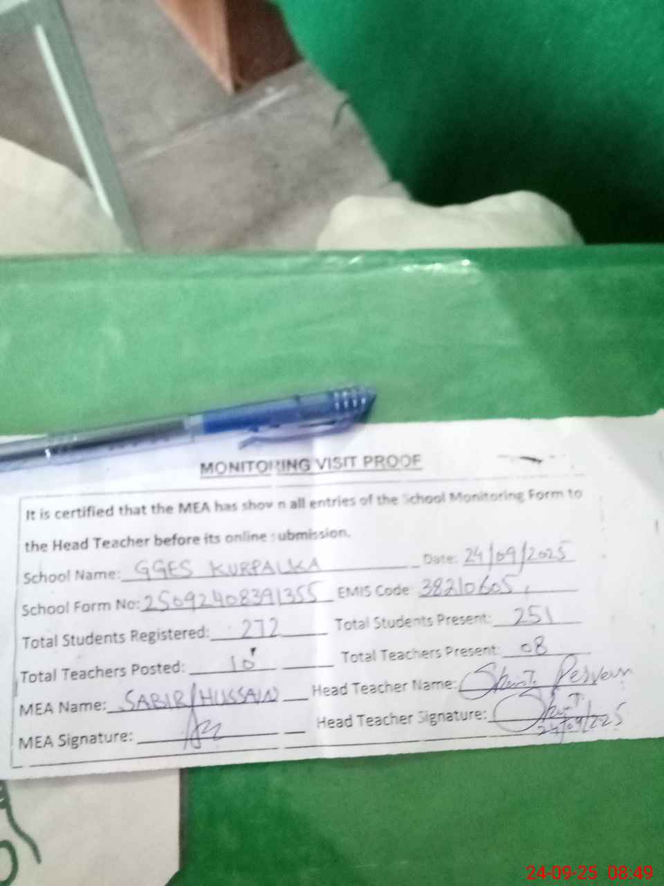 | Attendance Register | Head Teacher | MEA with School | Visit Proof |