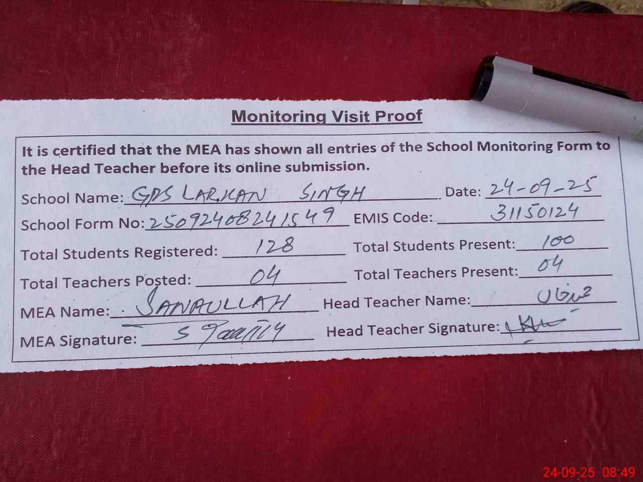 | Attendance Register | Head Teacher | MEA with School | Visit Proof |