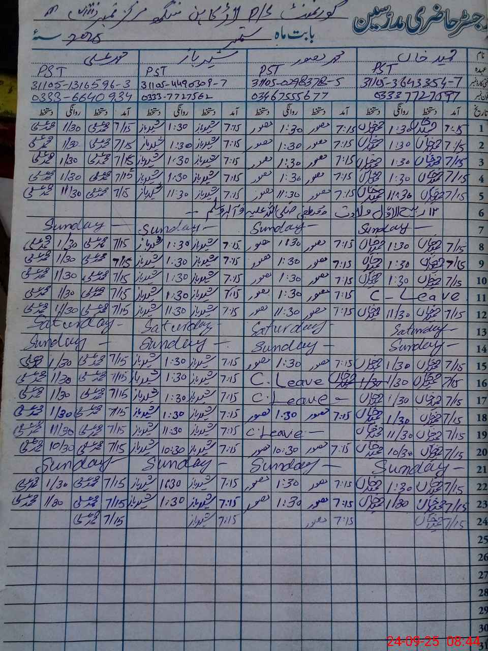 | CNIC | Full Name | Designation | R/C | Absence During Last Calender Month |