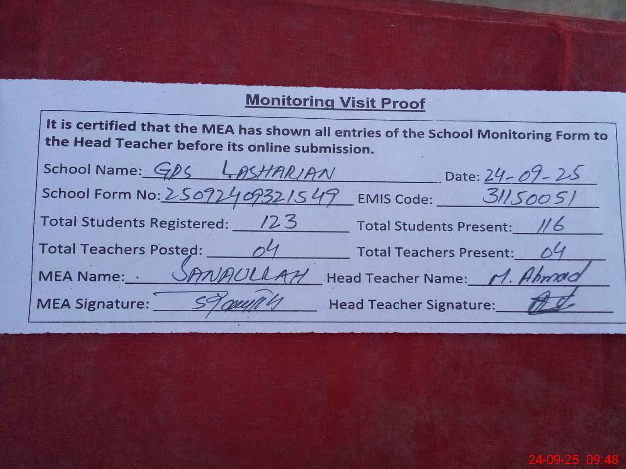 | Attendance Register | Head Teacher | MEA with School | Visit Proof |