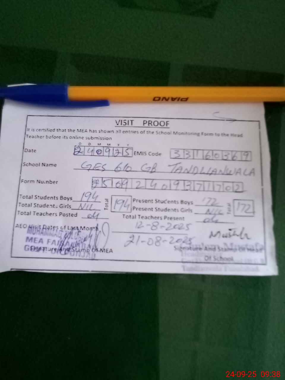 | Attendance Register | Head Teacher | MEA with School | Visit Proof |