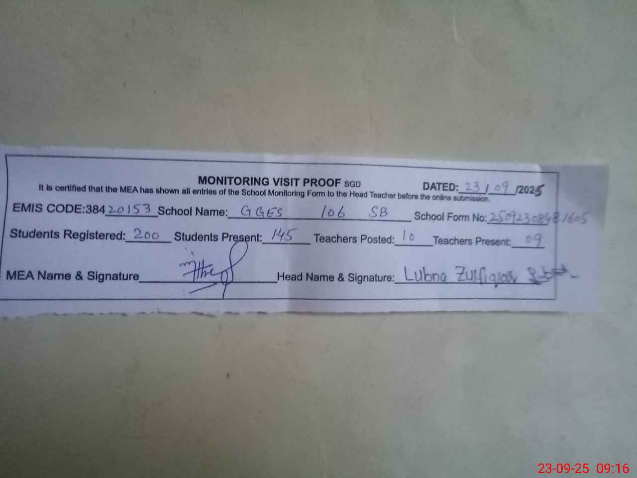 | EMIS Code: 38420153 | Name of School: GGES CHAK NO.106 SB | |||