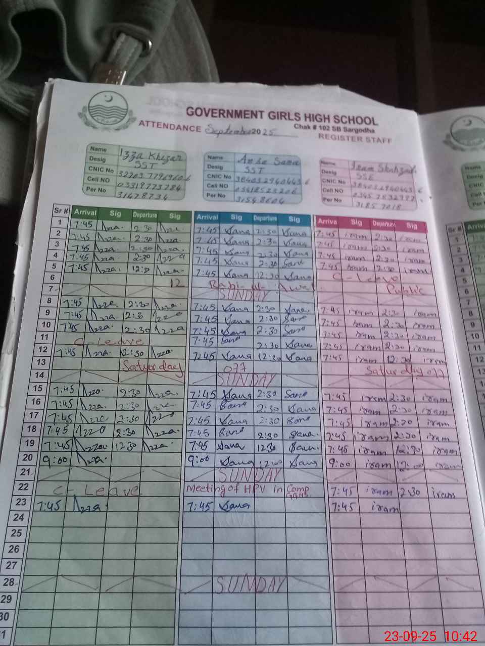 | CNIC | Full Name | Designation | R/C | Absence during last cal. month |