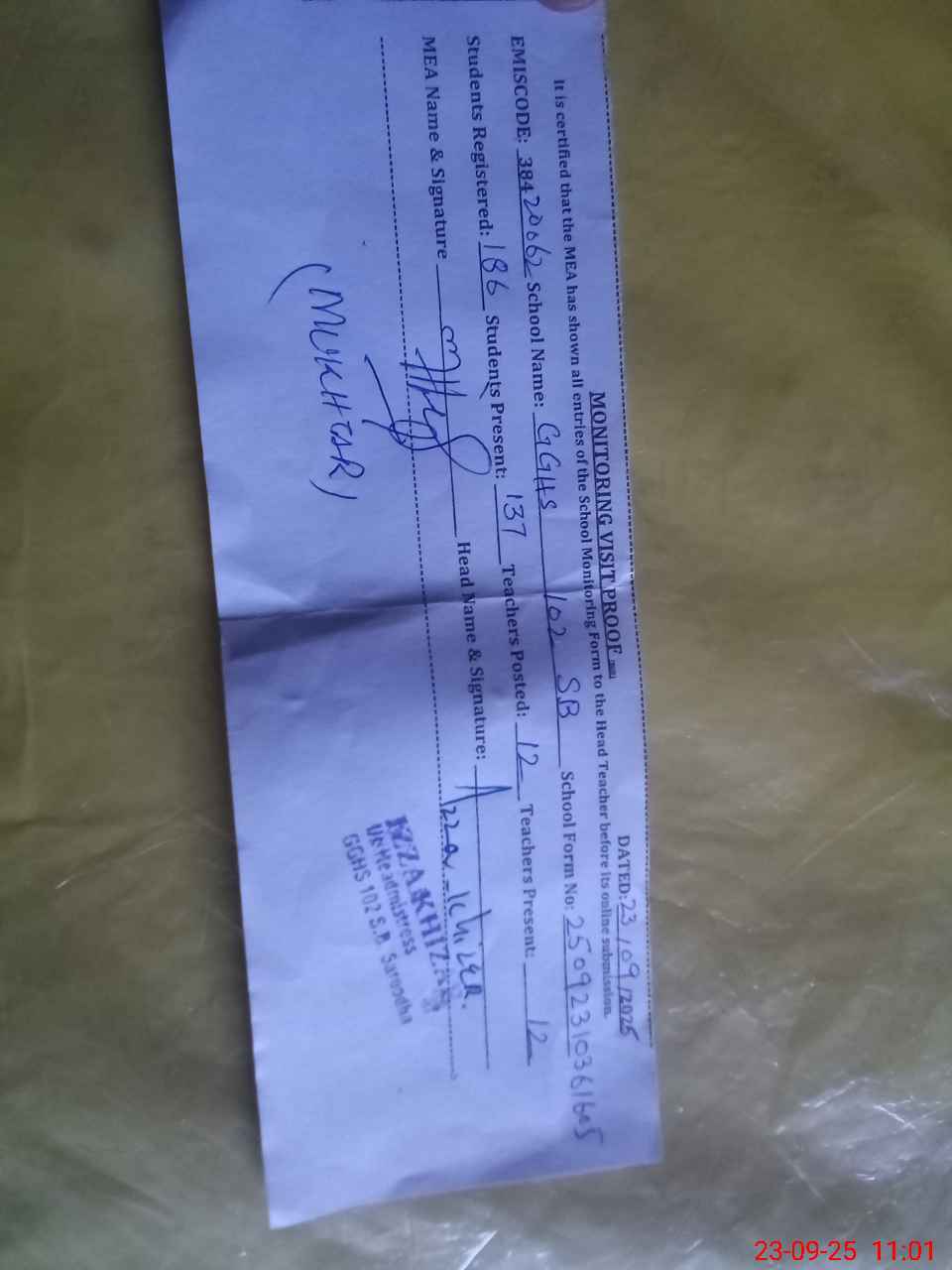 | Attendance Register | Head Teacher | MEA with School | Visit Proof |