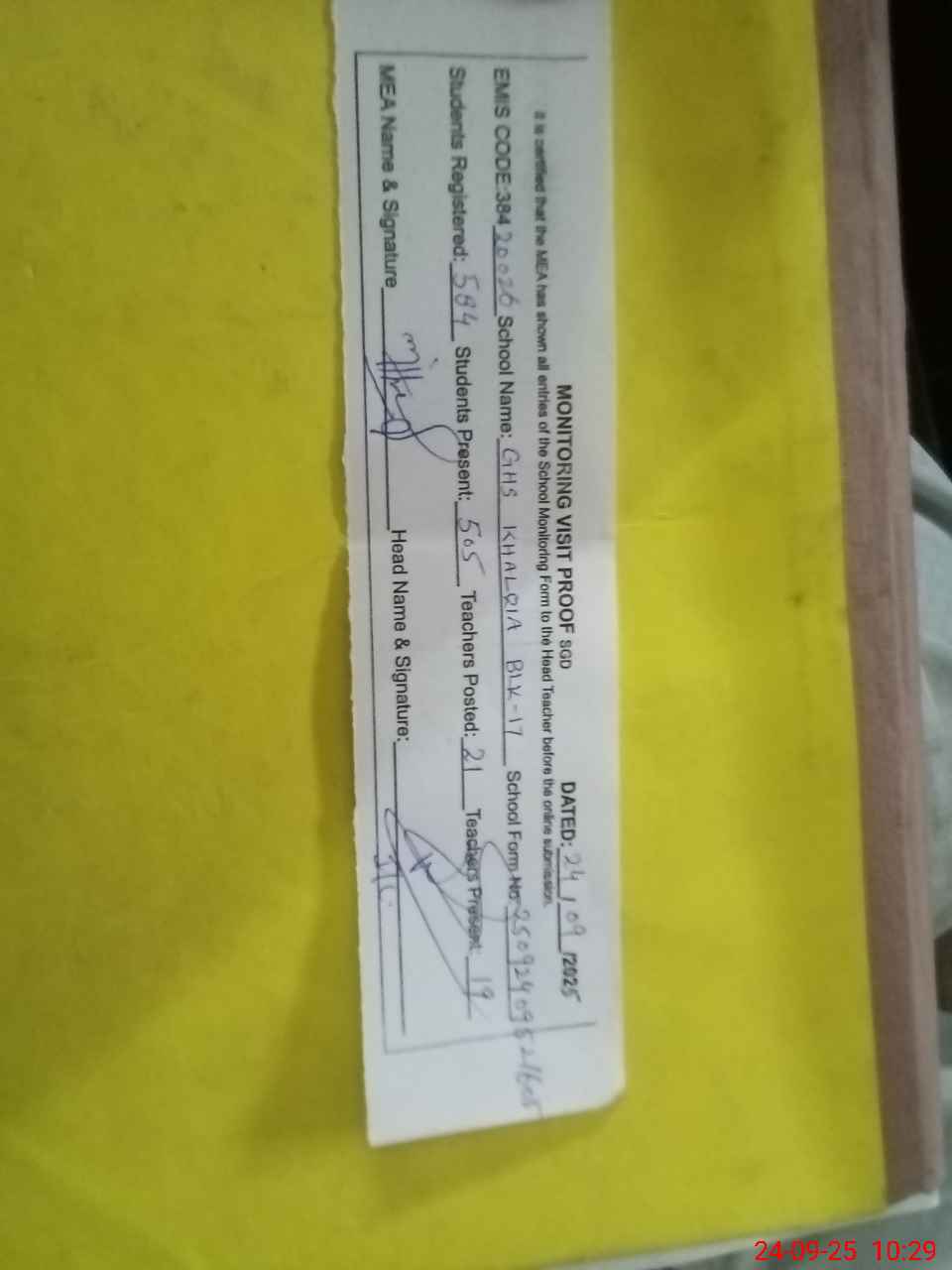 | Attendance Register | Head Teacher | MEA with School | Visit Proof |