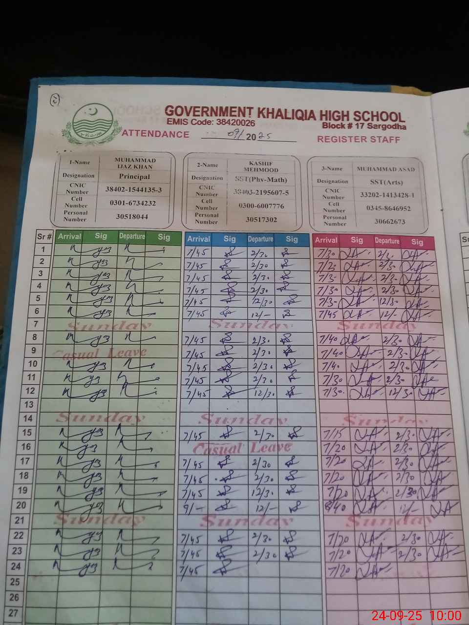 | CNIC | Full Name | Designation | R/C | Absence during last cal. month |