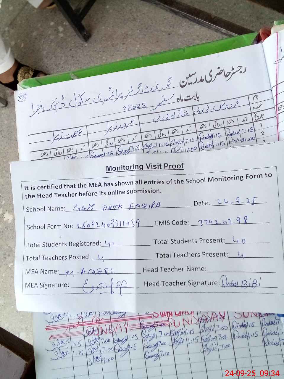 | Attendance Register | Head Teacher | MEA with School | Visit Proof |