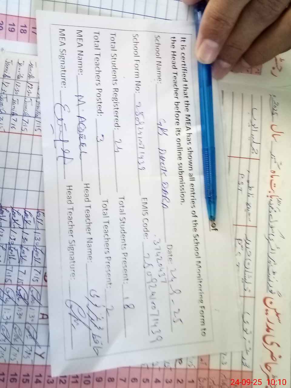 | Attendance Register | Head Teacher | MEA with School | Visit Proof |