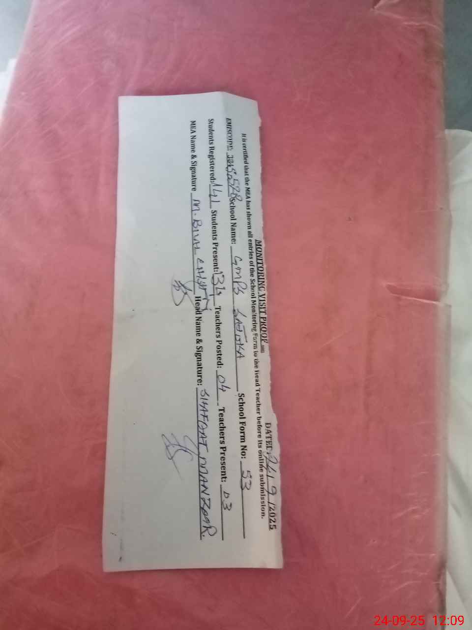 | Attendance Register | Head Teacher | MEA with School | Visit Proof |
