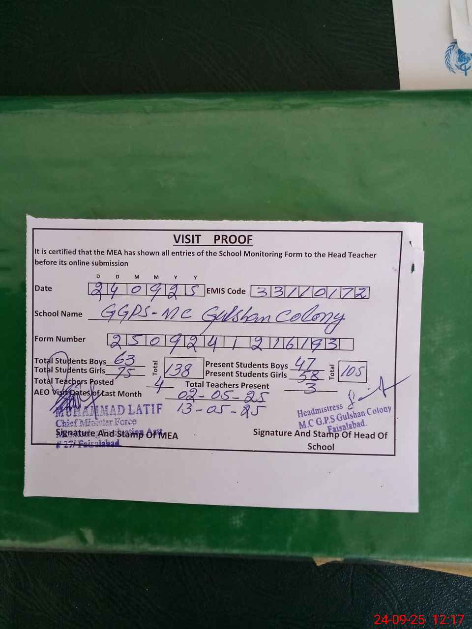 | EMIS Code: 33110172 | Name of School: GGPS MC GULSHEN COLONY | |||