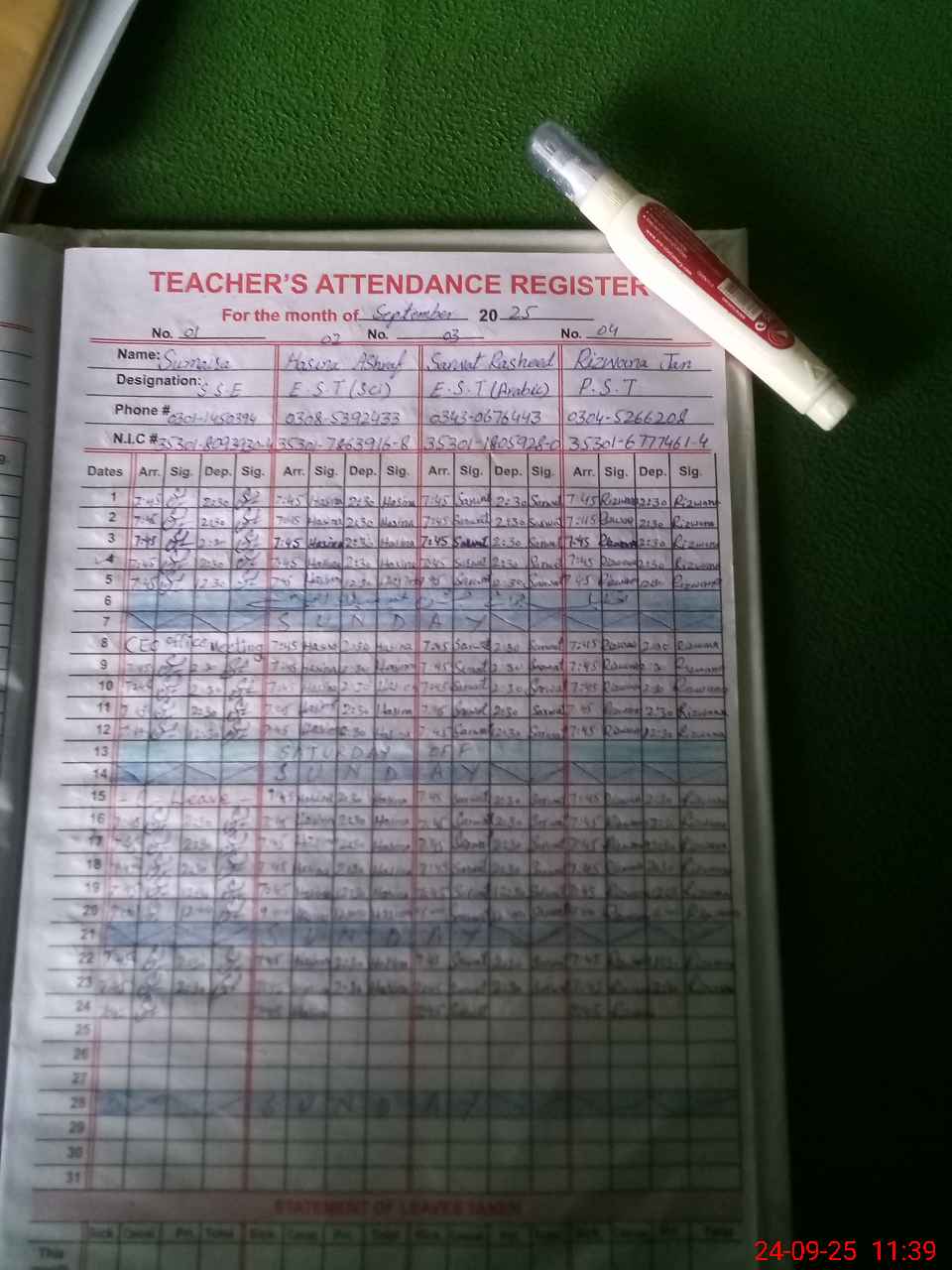 | CNIC | Full Name | Designation | R/C | Absence during last cal. month |