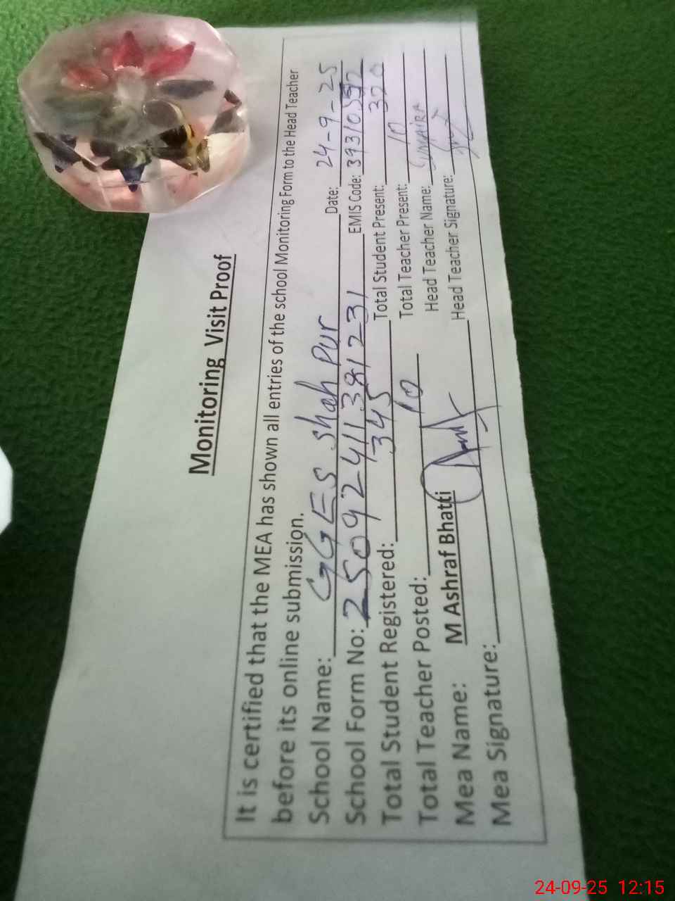 | Attendance Register | Head Teacher | MEA with School | Visit Proof |