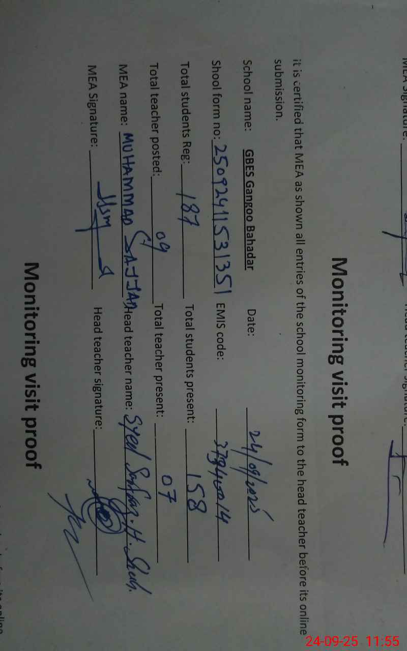 | Certified that this School was Inspected by the Undersigned MEA/DMO Today and the Information Stated Above is as Per Record. | |||||