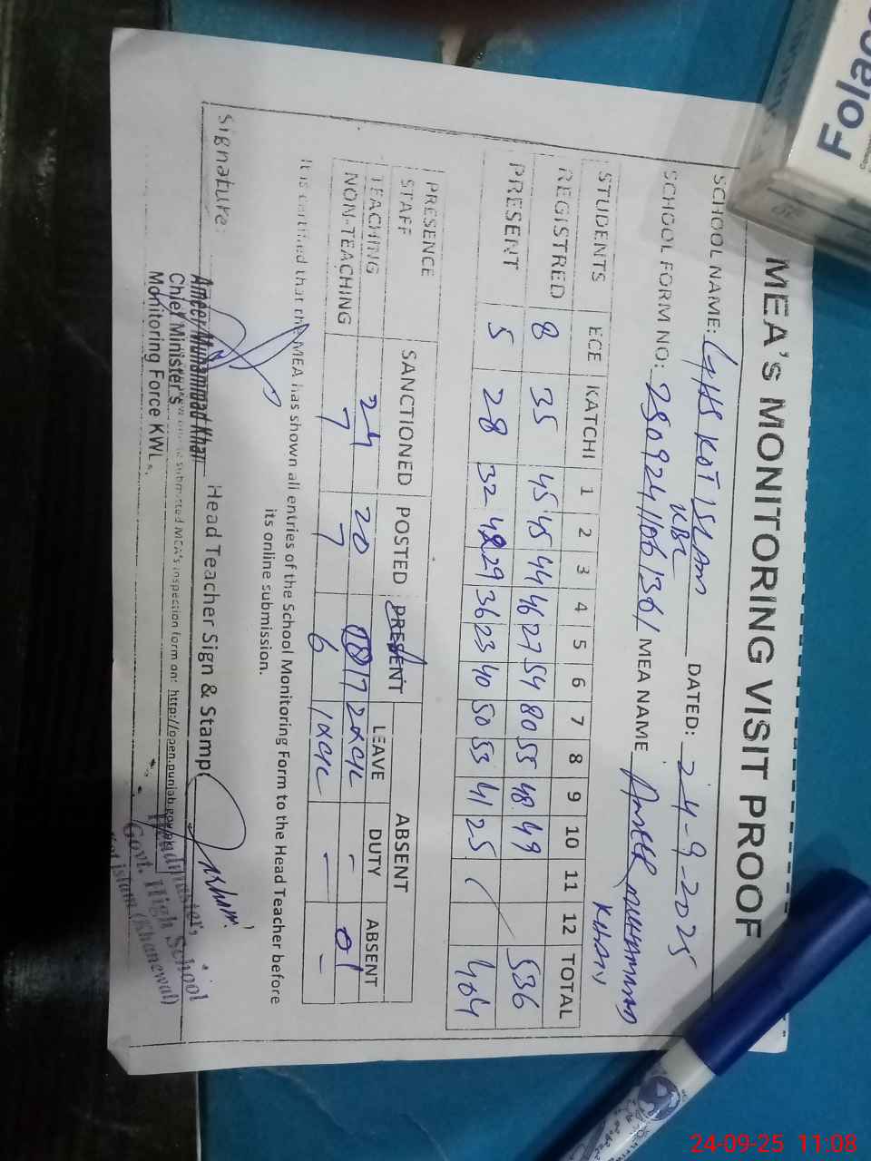 | Attendance Register | Head Teacher | MEA with School | Visit Proof |