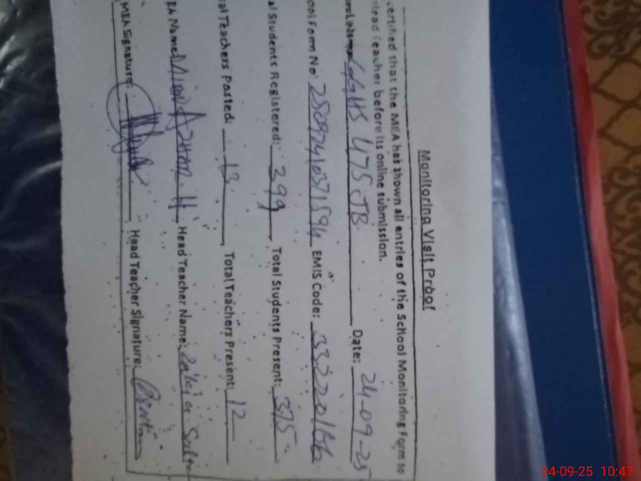 | Attendance Register | Head Teacher | MEA with School | Visit Proof |
