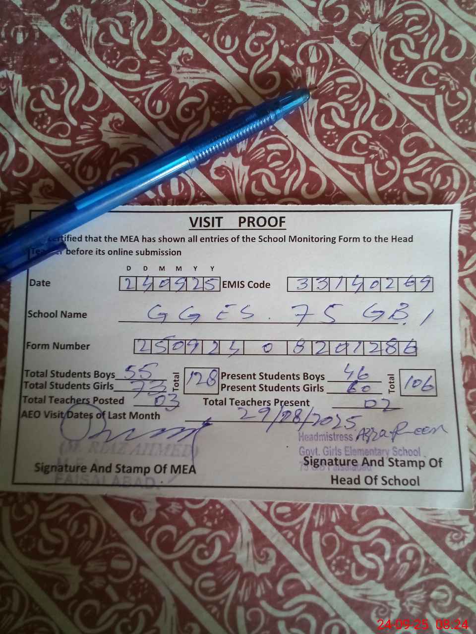 | Certified that this School was Inspected by the Undersigned MEA/DMO Today and the Information Stated Above is as Per Record. | |||||