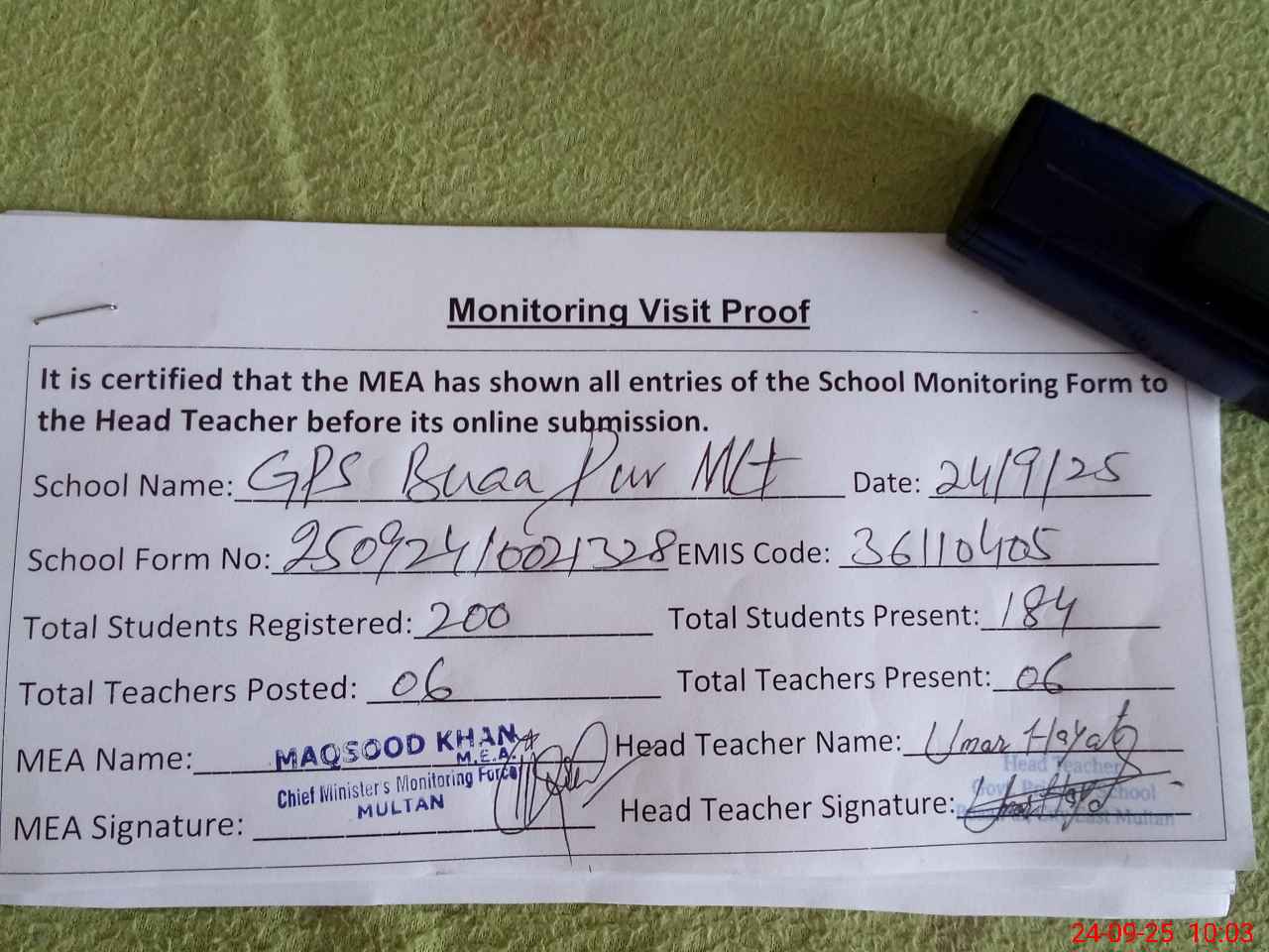 | Monitoring Date: 24-09-2025 | Start Time: 24-09-2025 09:55 AM | End Time: 24-09-2025 10:04 AM | Name of MEA: MA**** ULHA**** KH**** | |