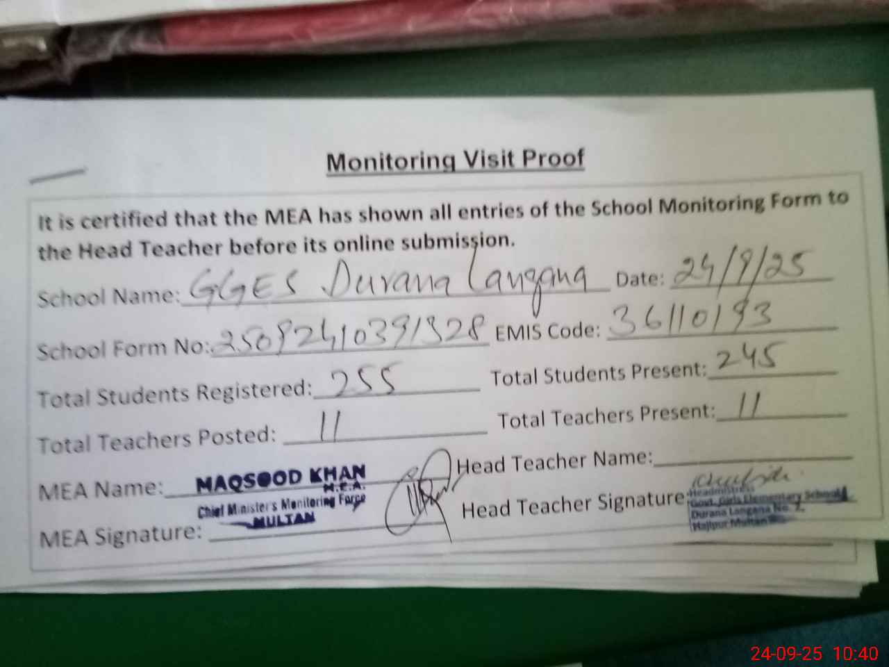 | Certified that this School was Inspected by the Undersigned MEA/DMO Today and the Information Stated Above is as Per Record. | |||||