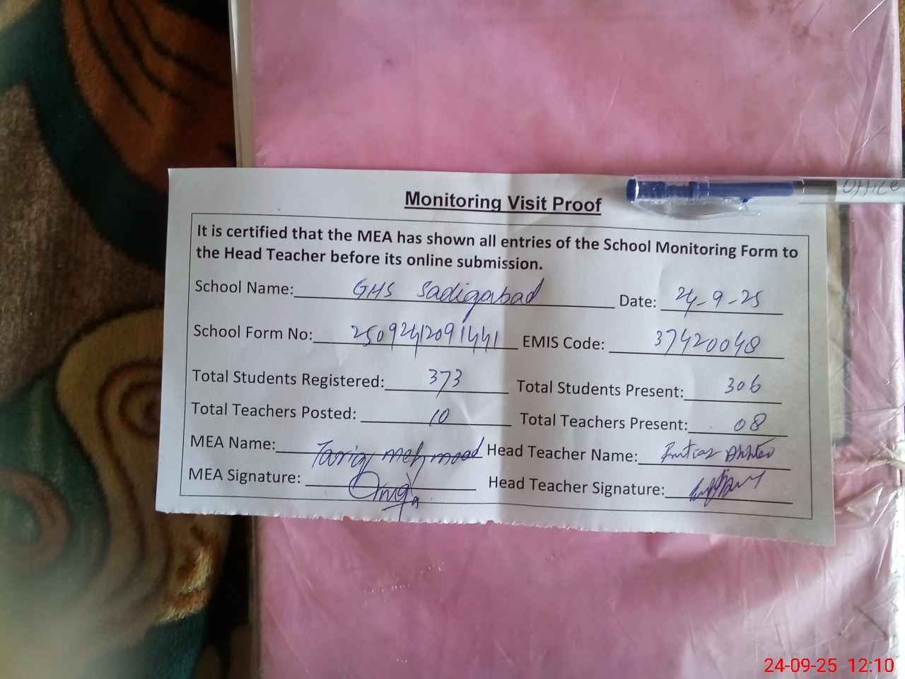 | Attendance Register | Head Teacher | MEA with School | Visit Proof |