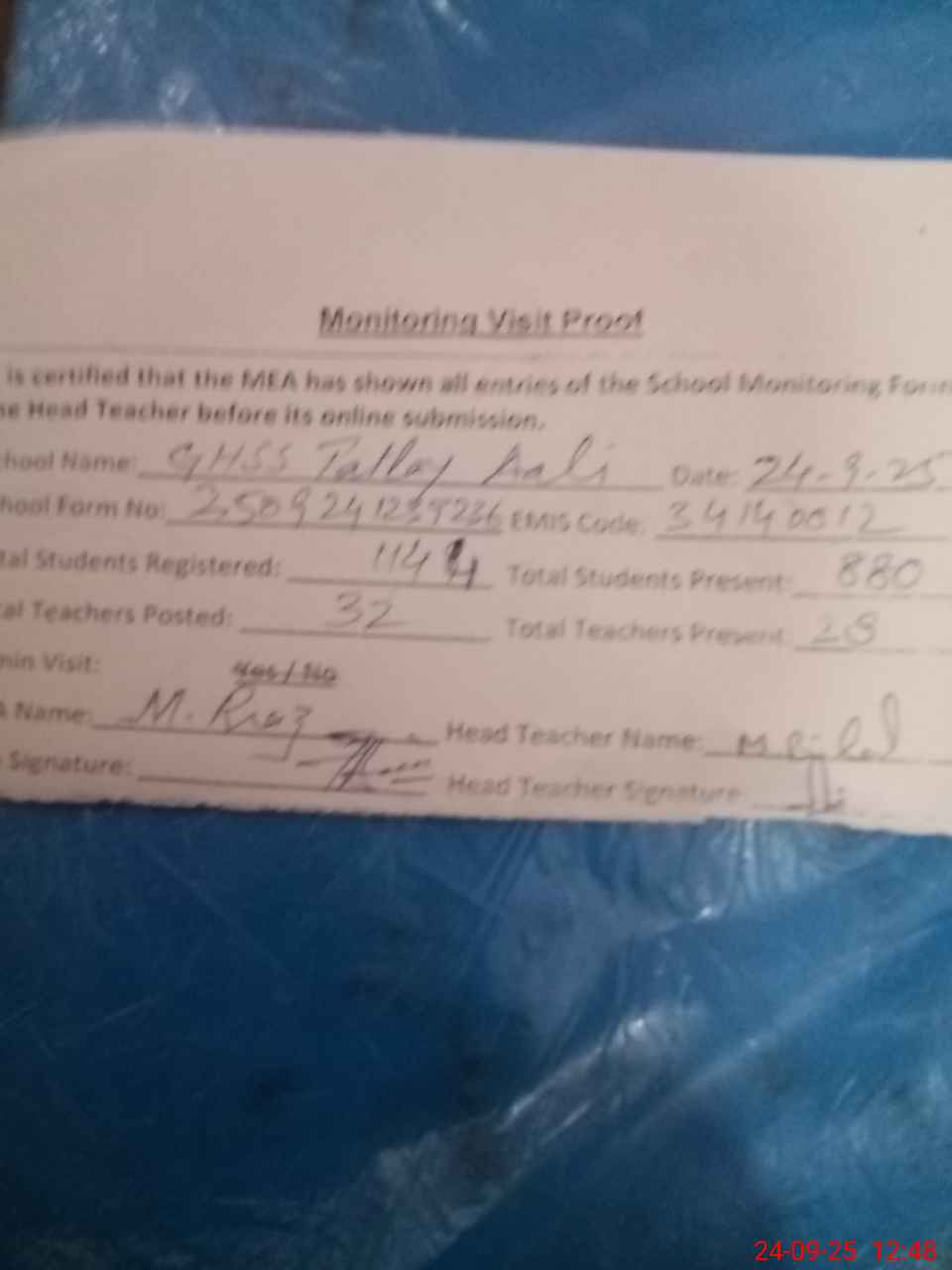 | Attendance Register | Head Teacher | MEA with School | Visit Proof |