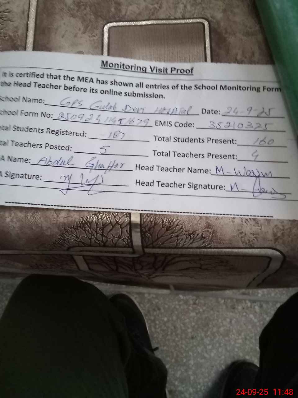 | Attendance Register | Head Teacher | MEA with School | Visit Proof |