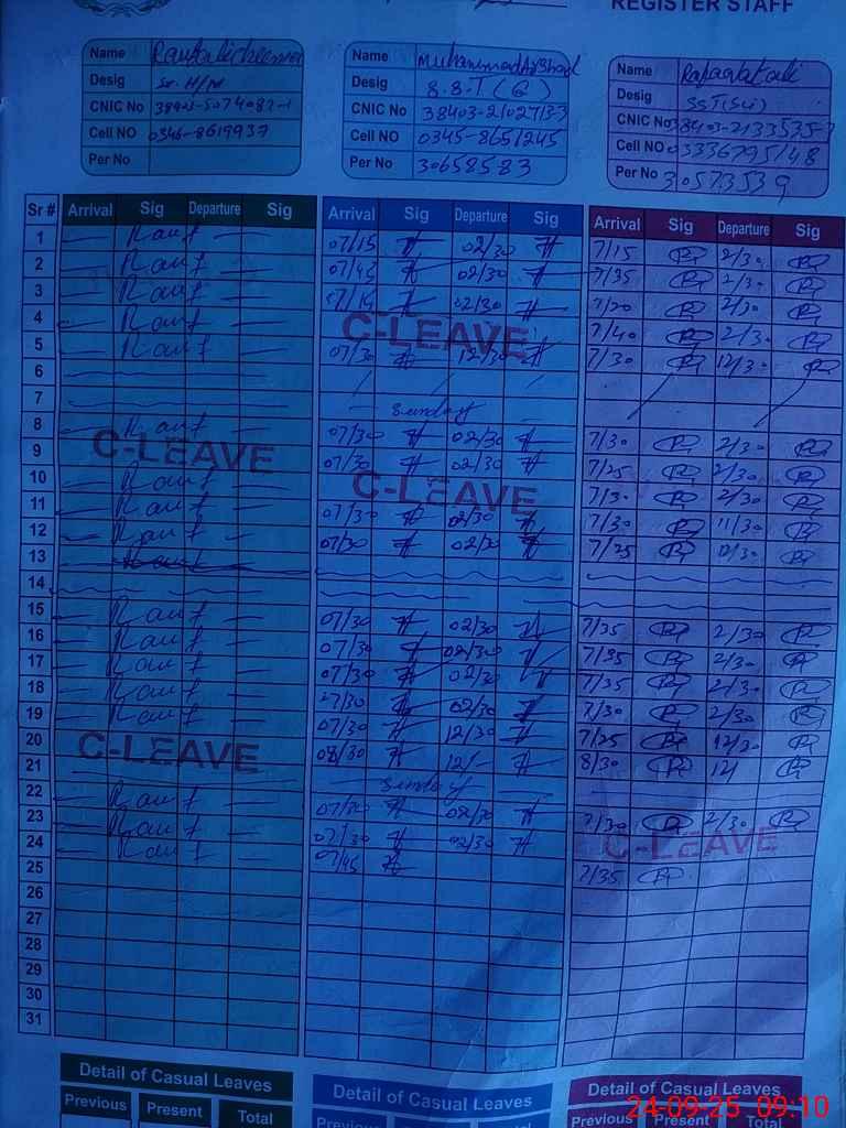 | CNIC | Full Name | Designation | R/C | Absence During Last Calender Month |