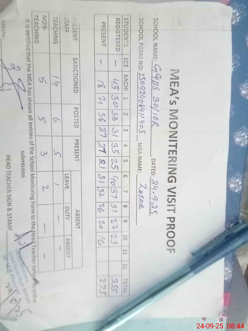 | Attendance Register | Head Teacher | MEA with School | Visit Proof |