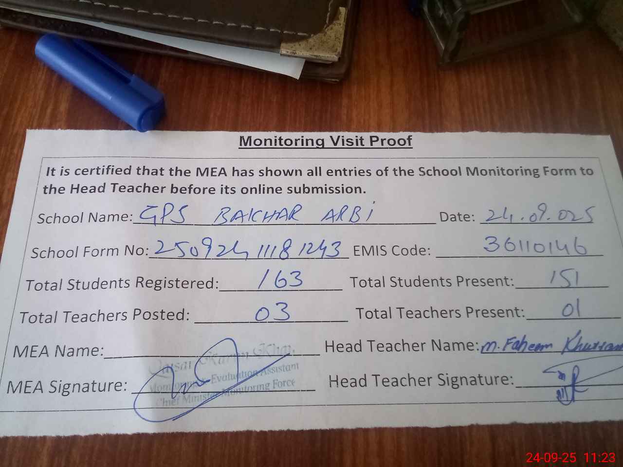 | Attendance Register | Head Teacher | MEA with School | Visit Proof |
