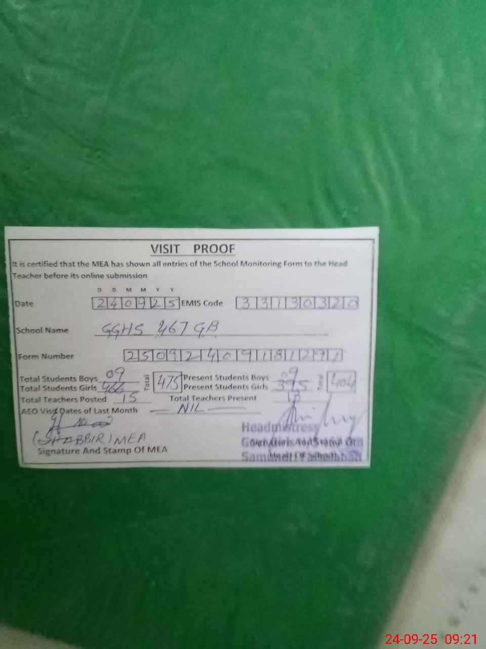 | EMIS Code: 33130320 | Name of School: GGHSS CHAK NO 467 GB | |||