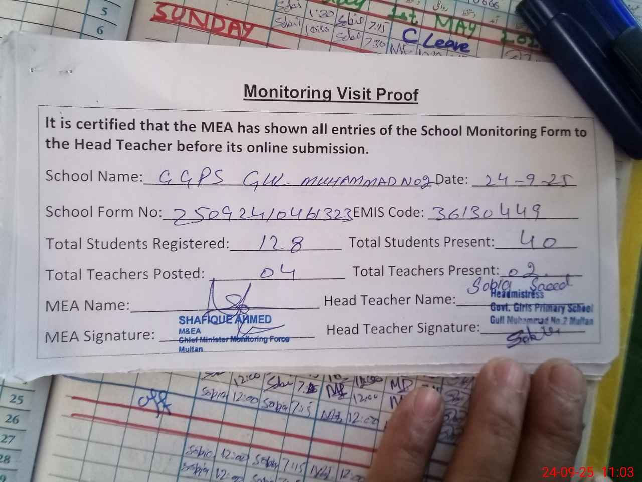 | Attendance Register | Head Teacher | MEA with School | Visit Proof |