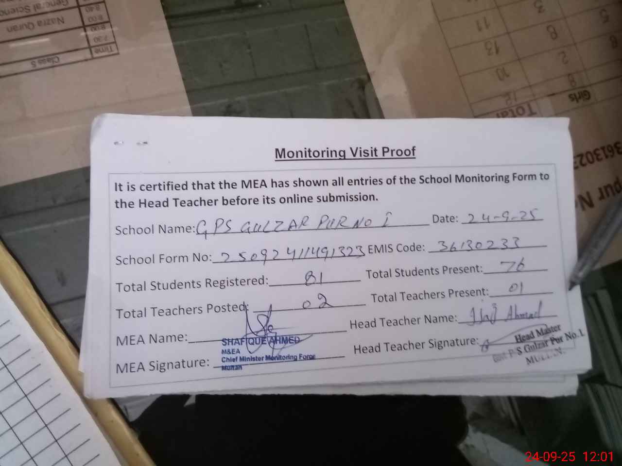 | Attendance Register | Head Teacher | MEA with School | Visit Proof |