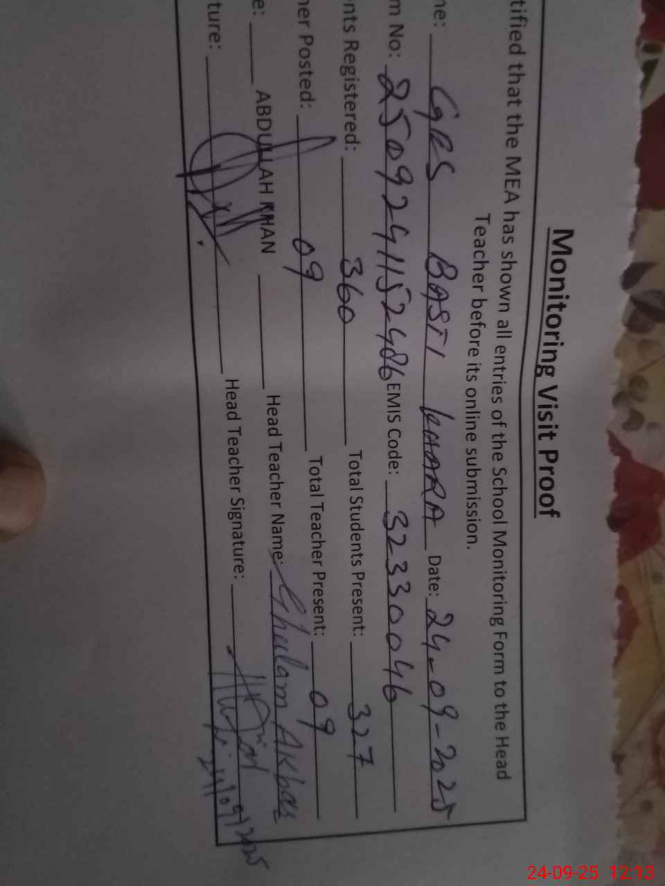 | Name: HA**** MU**** RA**** Designation: (School Headmaster's/Headmistress's) SST Phone/Cell Number: 03**** |